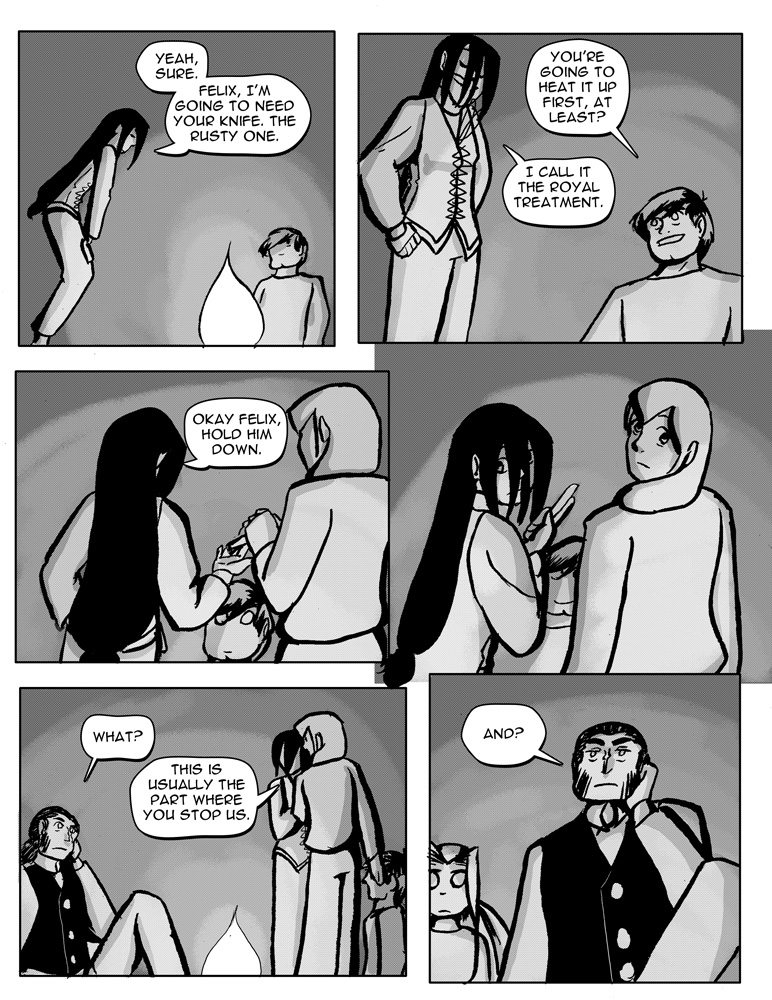 Again, ending a chapter is hard when everyone is in the same place they started, so my way out for this chapter was to have Melissa and Felix team up to be bad kids. Julian is gamely playing along because it's nice to be included. Leon knows exactly what they want him to do and is not here for it.